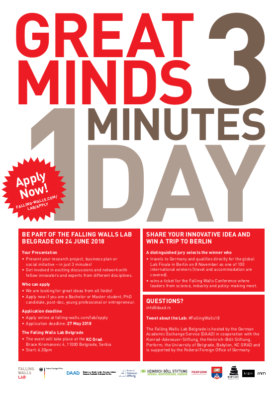 DAAD Информативни центар Београд у сарадњи са Фондацијом Konrad Adenauer, Фондацијом Heinrich Böll, Perform-ом, Универзитетом у Београду, Babylon-ом и КЦ Град-ом организује други Falling Walls Lab у Србији, иновативну платформу за представљање истраживачких пројеката у рангу научног пробоја у свим научним дисциплинама.