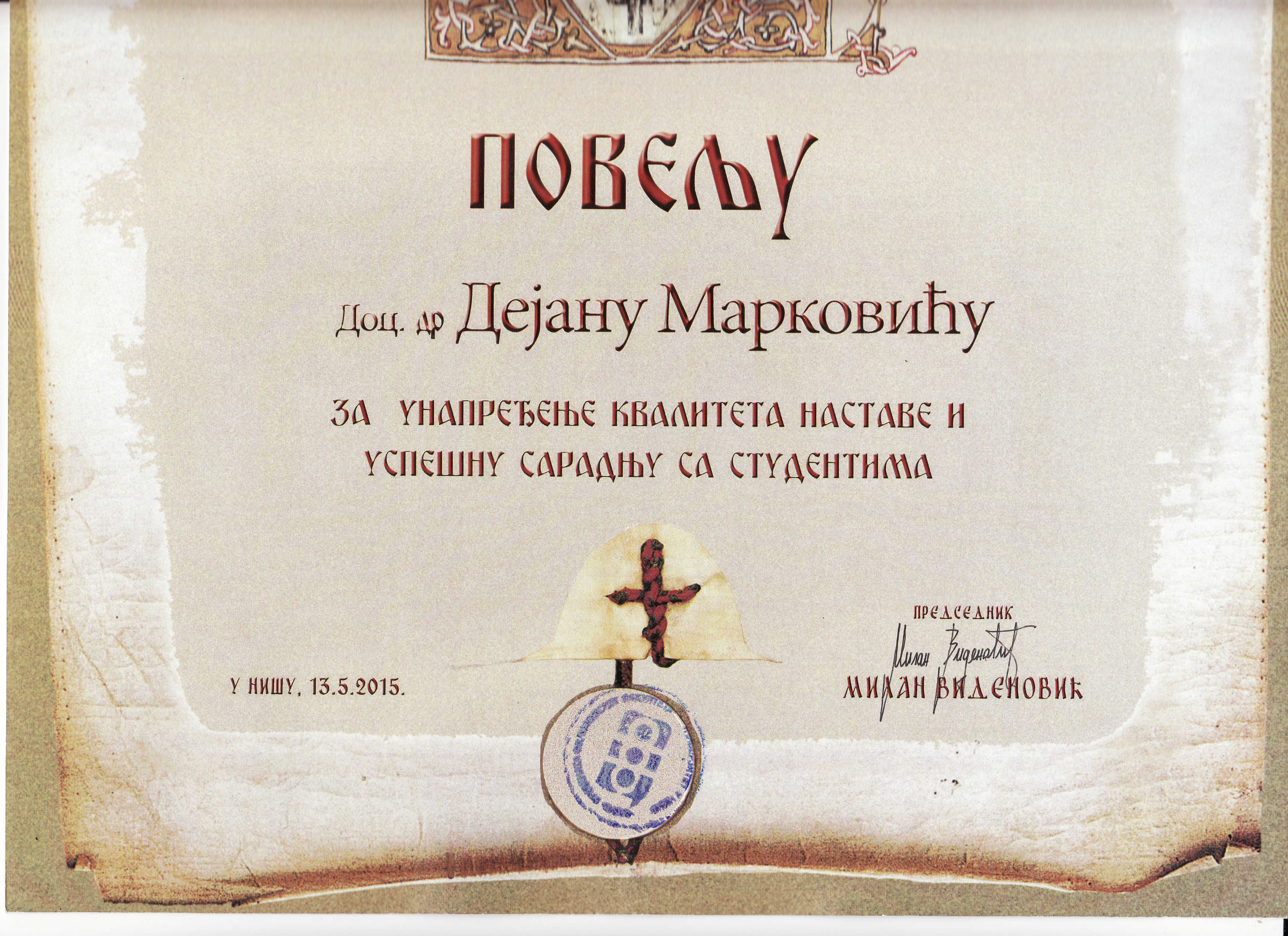 Лауреат је престижног XV Међународног Пушкинског такмичења Руски језик као језик победе (Москва, 6.06.2015). Организатори овог такмичења су "Россијскаја газета" и Влада Москве, а оно се организује уз подршку Министарства иностраних послова Руске Федерације и фонда "Руски свет".