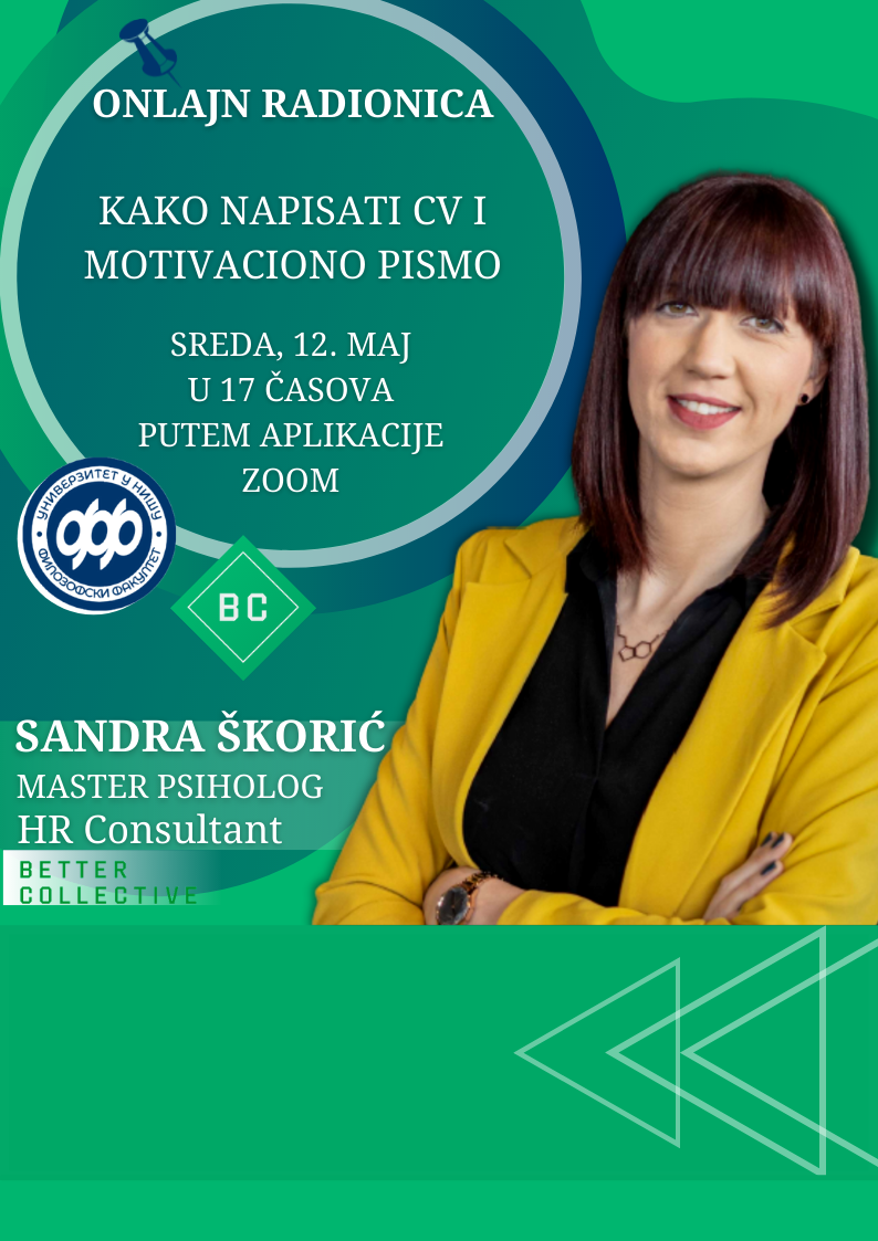 Радионицу ће водити Сандра Шкорић, мастер психолог и некадашњи студент нашег факултета, са вишегодишњим искуством у области људских ресурса, која тренутно ради на позицији консултанта за људске ресурсе у компанији Better Collective.