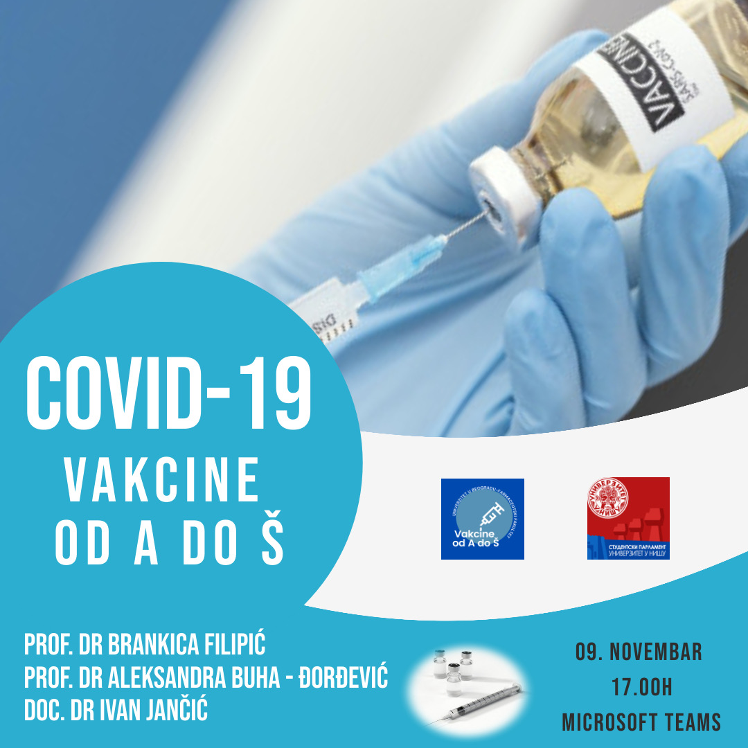 Студентски парламент Универзитета у Нишу у сарадњи са тимом професора са Фармацеутског факултета Универзитета у Београду организује онлајн предавање под називом “Ковид 19 - вакцине од А до Ш”. На предавању ће говорити: