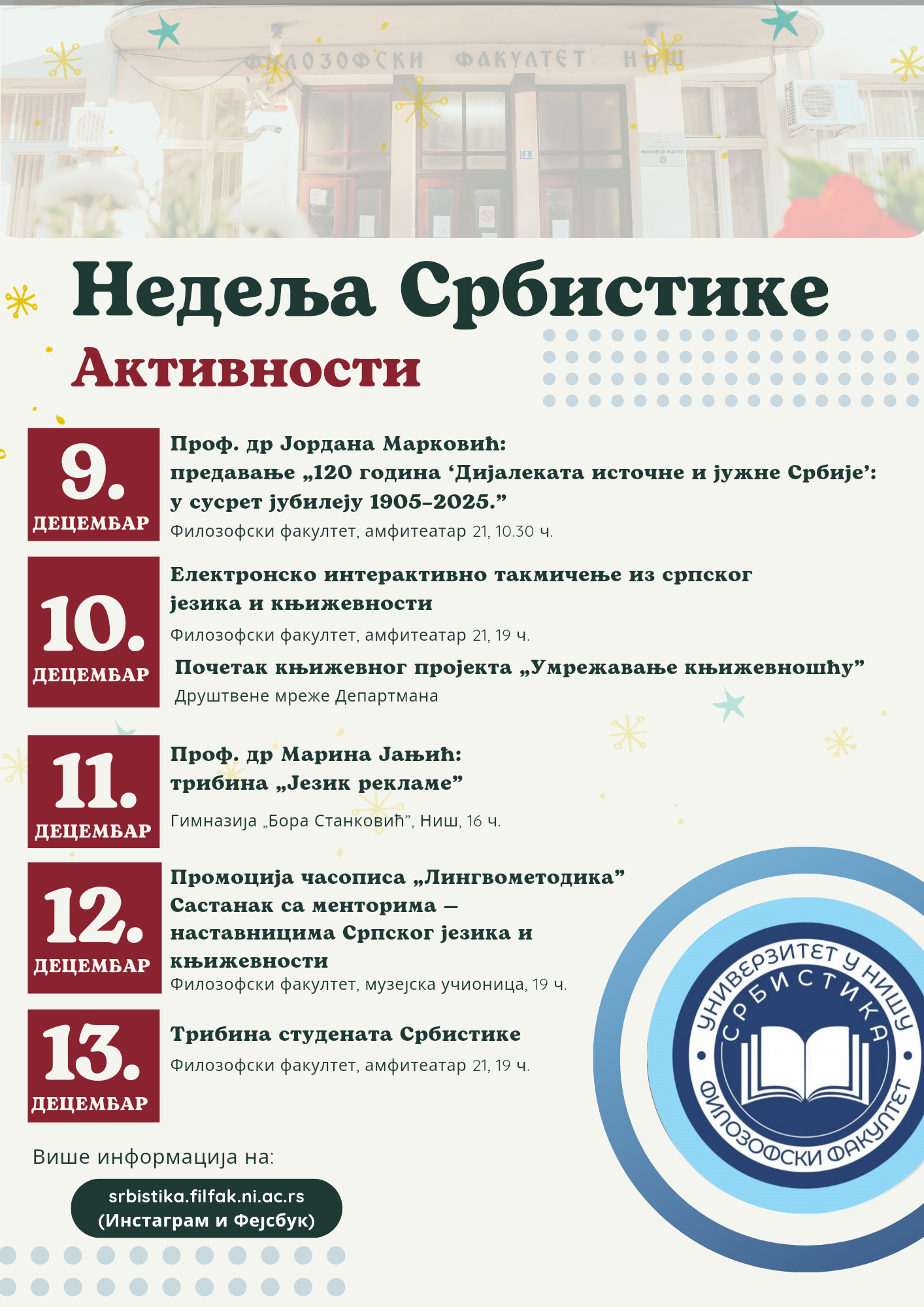 Департман за србистику и ове године одржава Недељу Србистике, и то у периоду од 9. до 13. децембра. Са задовољством позивамо ученике, студенте, наставнике српског језика и књижевности, садашње и некадашње студенте Србистике и све љубитеље српског језика и књижевности да се придруже активностима које је осмислио Департман.