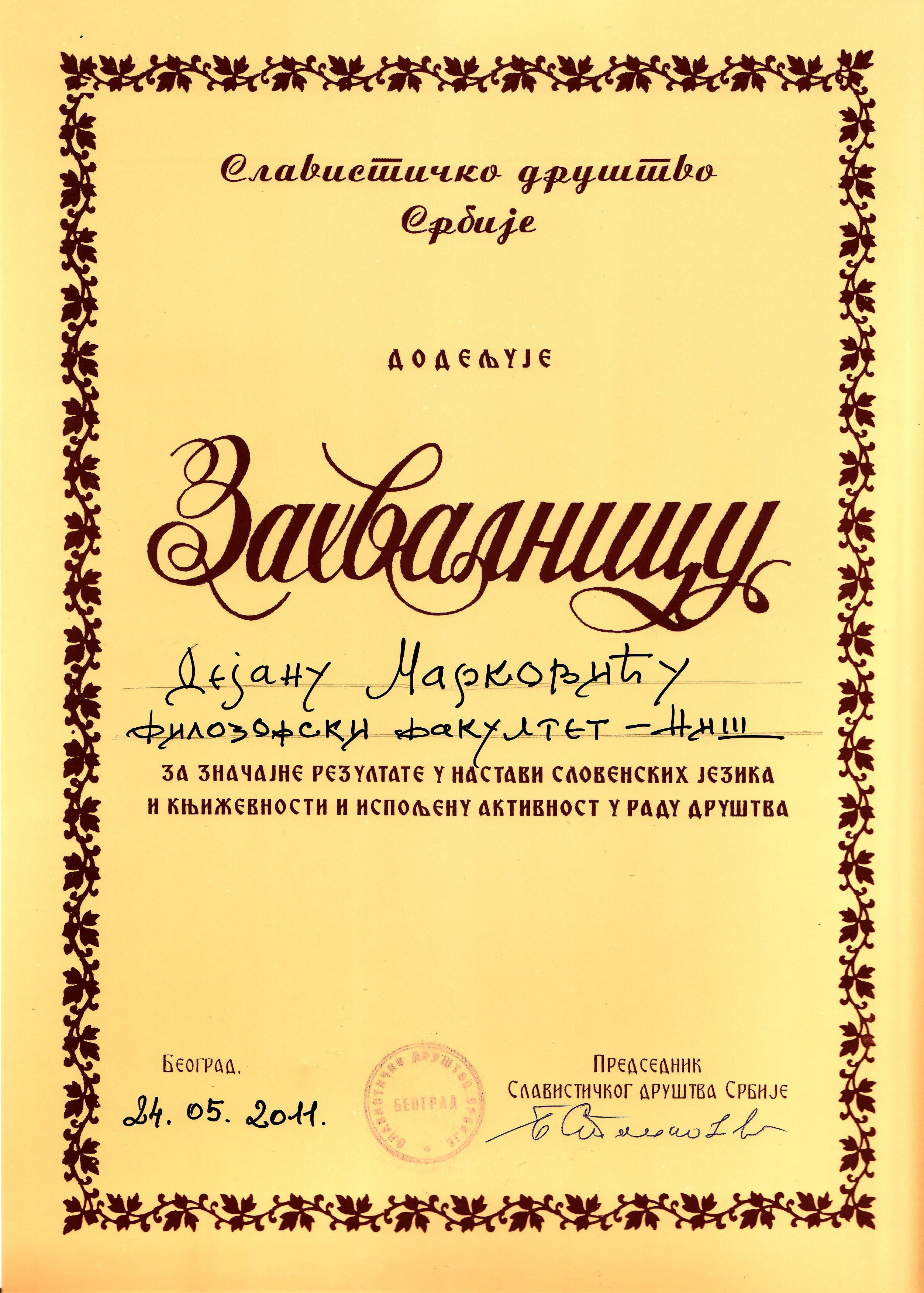 Лауреат је престижног XV Међународног Пушкинског такмичења Руски језик као језик победе (Москва, 6.06.2015). Организатори овог такмичења су "Россијскаја газета" и Влада Москве, а оно се организује уз подршку Министарства иностраних послова Руске Федерације и фонда "Руски свет".