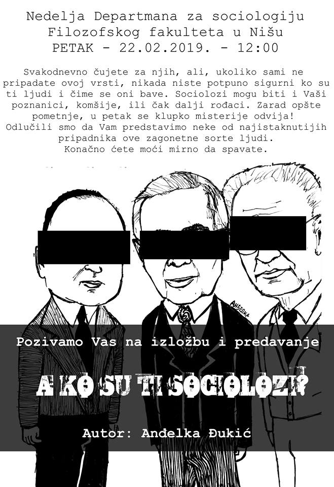 Петак 22. 2. у 12h (учионица 302) – изложба и предавање “А ко су ти социолози?” ауторке Анђелке Ђукић, социолошкиње из Београда.